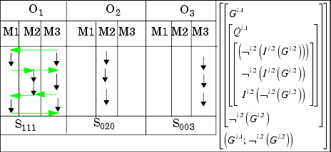 The construction starts in systemi.1 (in the diagram at O1M1=S1.1) by decision, then reflects and maps it inside of systemi onto systemi.2 (O1M1 to O1M2) and interacts in a next step with systemi-1(O2M2 to O3M2). The comparison of the two results, the beginning and the end of development, (Gi.1, noni-1Gi-1), has itself a representation in systemi-2 (O3M3 to O1M3). This development is achieved by applying a reflectional interpreter Ii.1 and a interactional interpreter Ii.j+1 successively. Obviously, the resulted comparison has not produced any contradiction. But nevertheless some kind of "deep-structure" of a contradiction is preserved: we only have to cancel the notation of locations and dislocations, that is, the indices, to obtain our well known contradiction. Thus the structure of the construction is mapping the contradiction in its behavior but not in its semantics. The comparison as an incomparability can now be studied in its own contexture, say systemi-2. A first step can be to ask about the distance between the compared sub-systems and how this distance is characterizing the whole system as such.